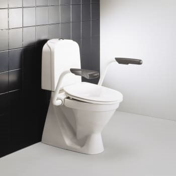 Ergonomisk armstøtte fra Pressalit Care til montering på toilet for let støtte og selvhjulpenhed ved toiletbesøg. Støttearmlænene har solide, polstrede greb, der aflaster arme og hænder samtidig med, at de er en god hjælp, både når man står, sætter og rejser sig. Da armstøtterne kan slåes individuelt op, optager de ikke unødvendig plads i rummet, når de ikke er i brug. Armstøtten leveres med et Pressalit R37 Dania toiletsæde.