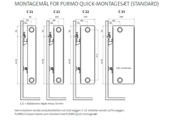 Purmo Compact C21 højde 900 mm, er en klassisk panelradiator, som er opbygget med to plader og en konvektionslamel. Den har standard 4 sidevendte anboringer, ABCD og leveres med 1 luftskrue og 1 blindpropper og Purmo vægkonsoller. Purmo Compact C21 har et tidløst og traditionelt design og leveres som standard i farven hvid, RAL 9016.