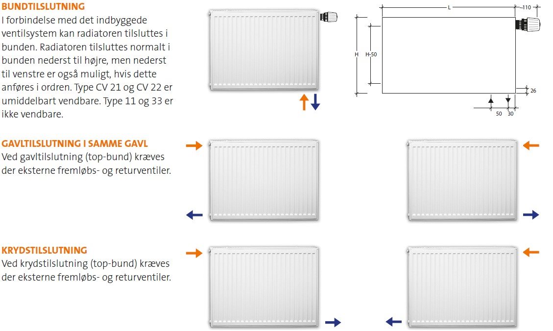 Er man i tvivl om radiatoren yder nok i forhold rummets størrelse vil vi anbefale, at man vælger en der enten er højere, længere eller dybere. Da man herved undgår, at radiatoren er underdimensioneret.