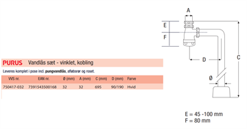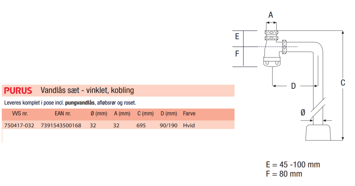 Purus 32mm x 1.1/4" justerbar vandlås - komplet inkl. pungvandlås, afløbsrør og roset.