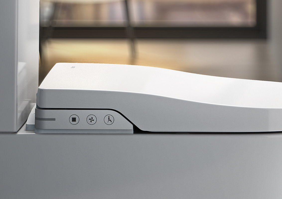 Toilettets douche- og tørrefunktion kan betjenes med den simple og intuitive fjernbetjening, men basale funktioner kan også tilgås manuelt på siden af sædet.