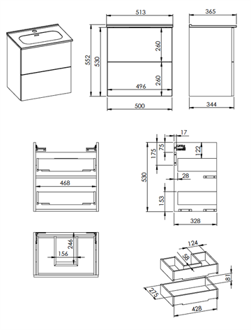 Møblet kun er forberedt for afløb i væg og ikke til afløb i gulv, da der kun er 28mm fra bagkant af skuffe