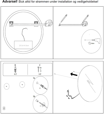 Spejlet ophænges på væggen ved, at skrue to skruer i væggen, herpå hægtes ophængsbeslagene der er fastgjorte bagpå spejlet. Al elektronik, herunder LED drivere m.m. er formonteret på spejlets bagside, det medfølgende kabel tilsluttes direkte til 230V.