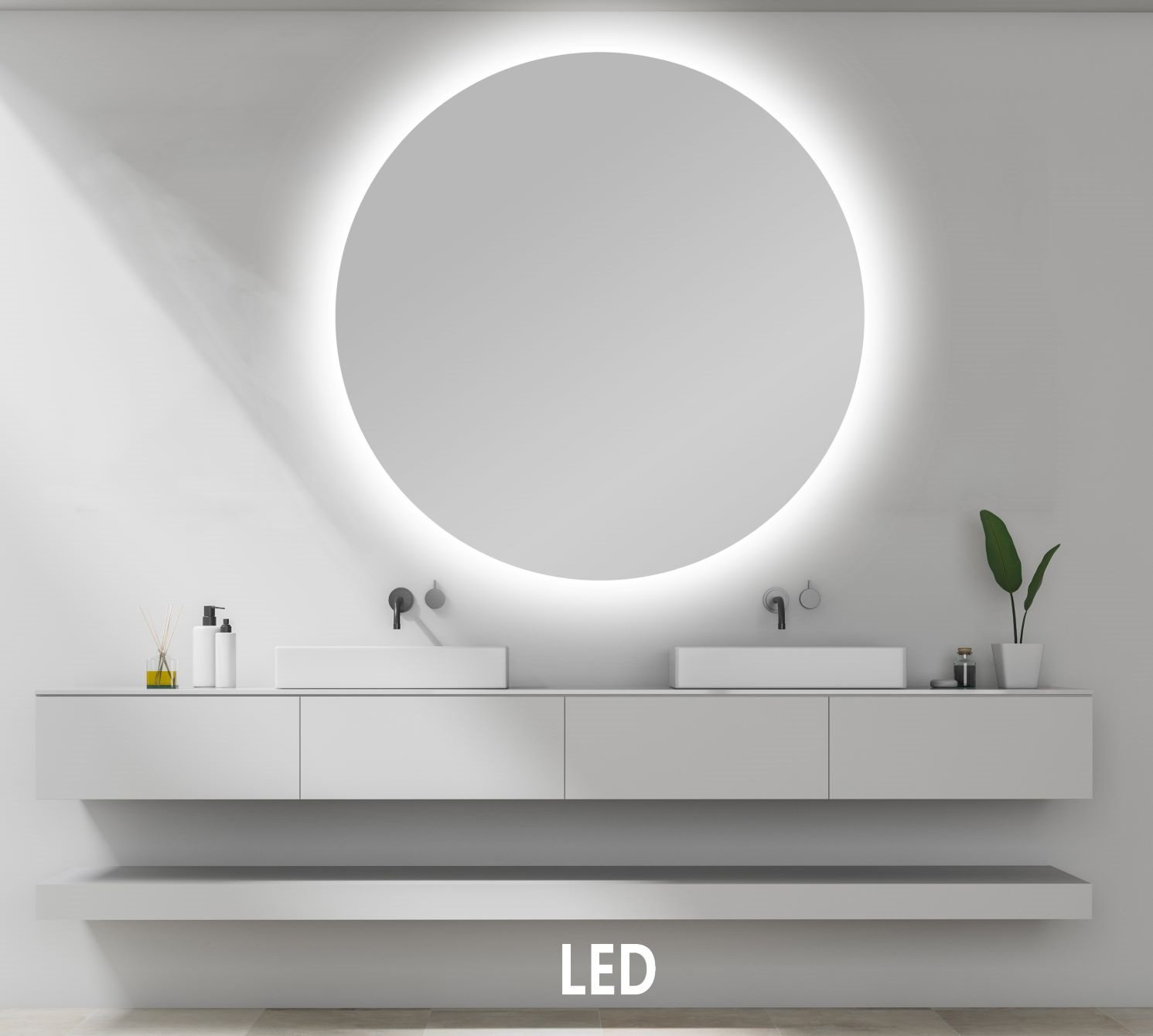 Rundt spejl med LED backlight. Spejlet er lavet af belgisk AGC MIROX eco glas.