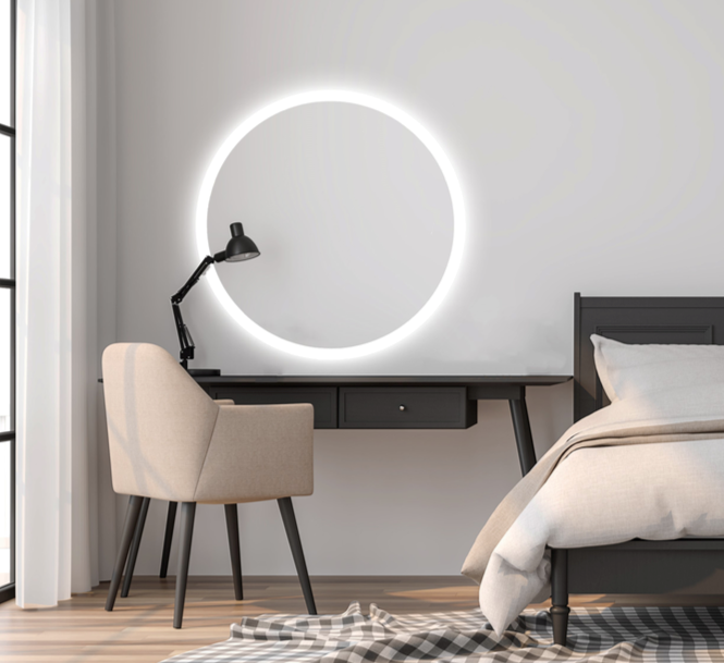 Rundt spejl Ø60 cm med integreret LED front lys og backlight samt lysstyring. Spejlet er lavet af belgisk AGC MIROX eco glas.