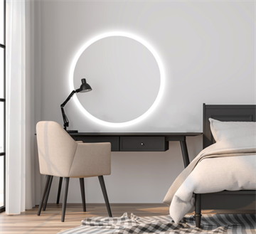 Dette runde spejlet har integreret front og baggrundsbelysning, på fronten er der integreret Touch switch med tænd og sluk samt mulighed for at justere lysets styrke fra 3000K optil 6000K