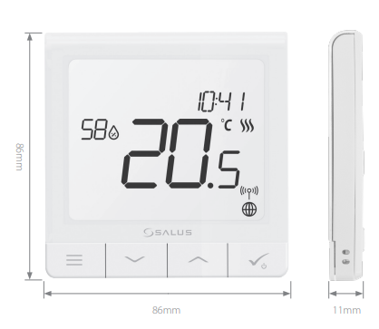 rumtermostater eller endnu nemmere via en App på smartphone, tablet eller computer. Appen er gratis og med den er det nemt overskueligt at ændre alle indstillinger i hele systemet uanset om du er på farten eller er hjemme. Quantum rumtermostaten leveres med indbygget genopladeligt LI-ION batteri, som er nemt at genoplade med et micro SD kabel / stik. Rumtermostatens mål er H:86mm x B:86mm x D:11mm.