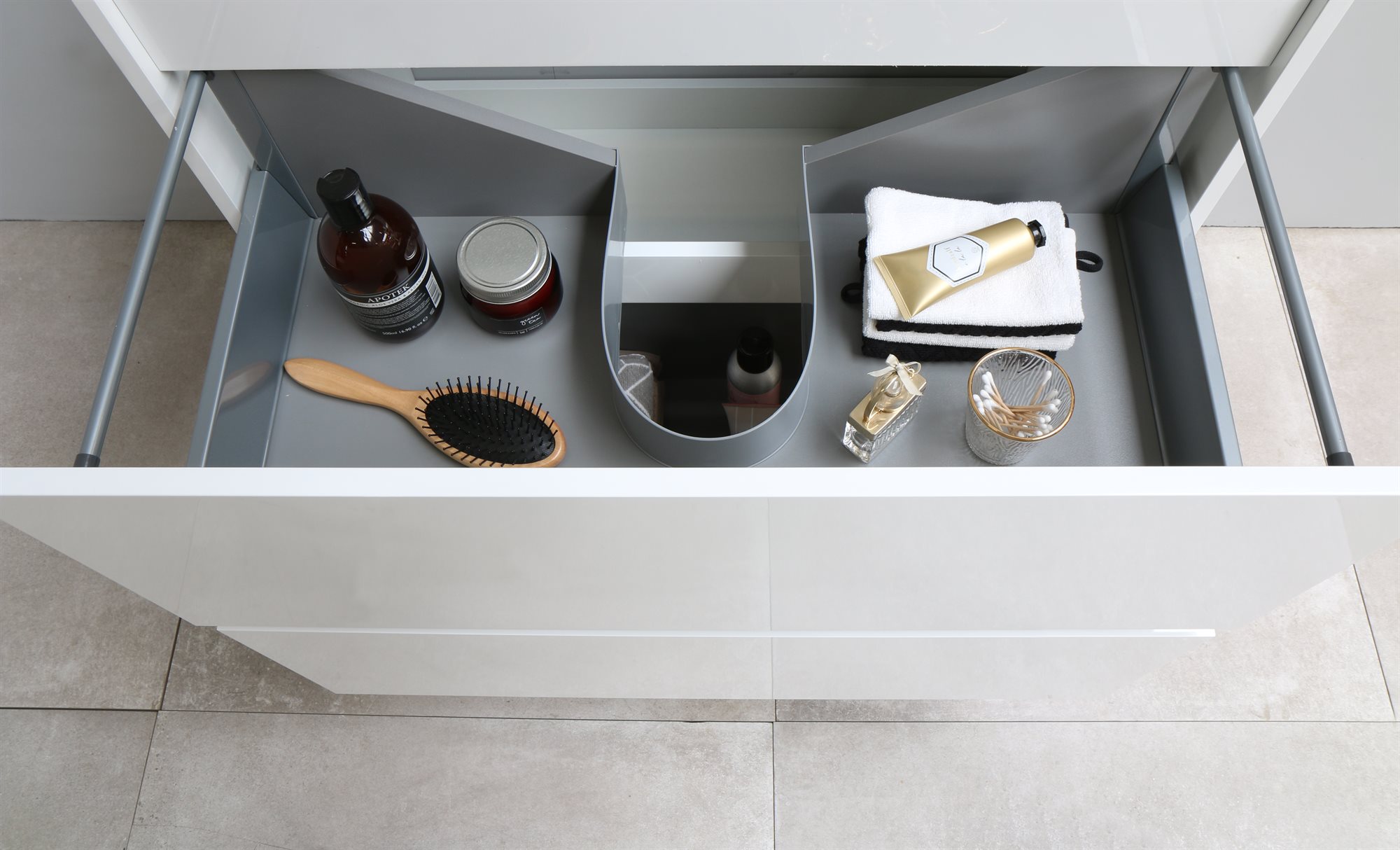 Korpus er i elegant og tidløs hvid højglans, der giver dig frihed til at tilføje forskellige farver og materialer, der matcher din stil. Det kan være et håndvaskarmatur i sort eller messing frem for en klassisk løsning i krom.