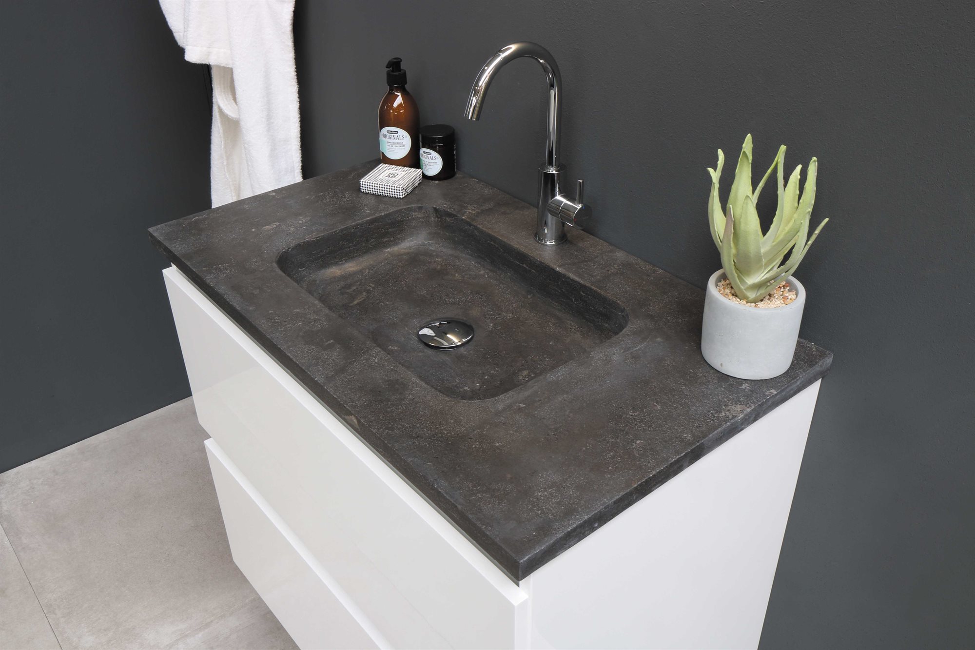 Til sættet hører en sort stenvask med råt udseende. Stenmaterialet er et naturligt og robust materiale og fremstår unik med sin farve og struktur. Badvasken har ligeledes hanehul til en vandhane.