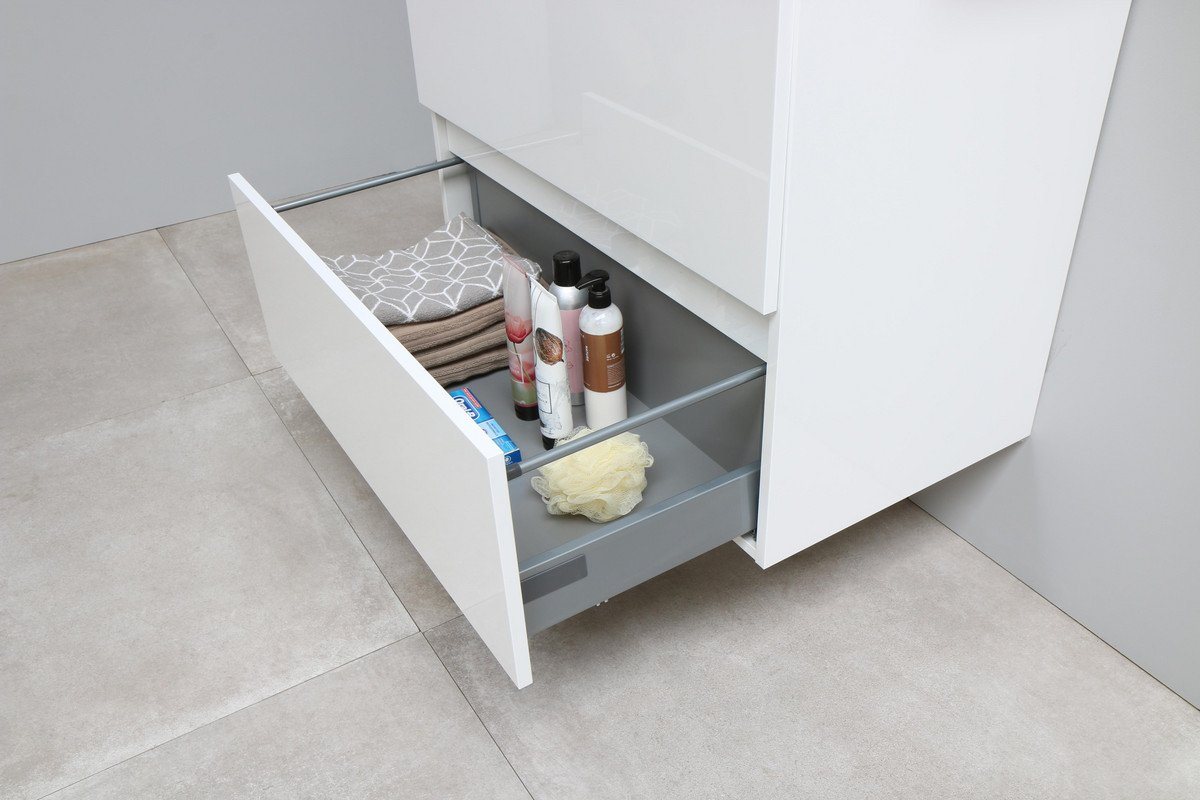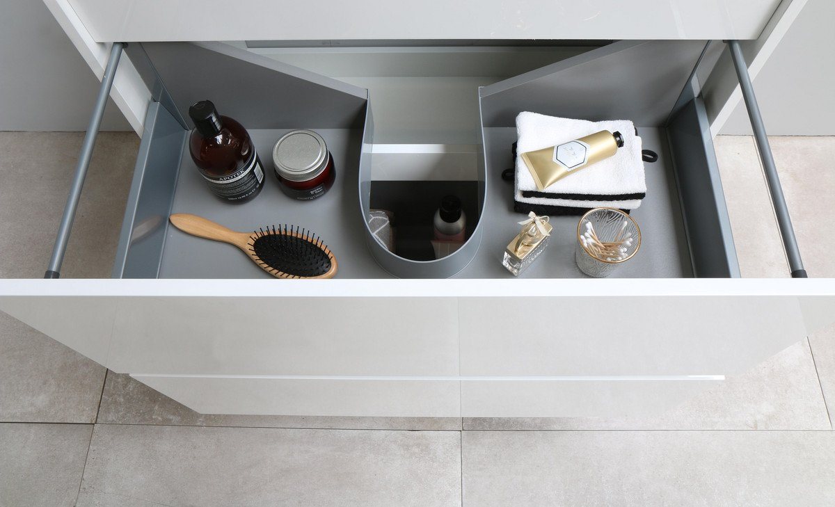 Det vægmonterede underskab er kendetegnet ved sin store rummelighed grundet de høje skuffer, og der er rigeligt med plads til opbevaring af håndklæder, hårtørre og andet udstyr. Skufferne er fuldt udtrækkelige og med softclose. Takket være møblets dæmpersystem lukker skufferne stille og roligt. Vaskeskabet er ligeledes uden greb, som skaber rene linjer og et smukt tidløs design - Grebsfri minimalisme.