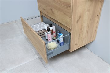 Det vægmonterede underskab er kendetegnet ved sin store rummelighed grundet de høje skuffer, og der er rigeligt med plads til opbevaring af håndklæder, hårtørre og andet udstyr. Skufferne er fuldt udtrækkelige og med softclose. Takket være møblets dæmpersystem lukker skufferne stille og roligt. Vaskeskabet er ligeledes uden greb, som skaber rene linjer og et smukt tidløs design - Grebsfri minimalisme.