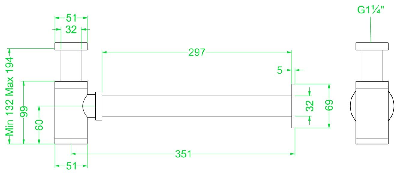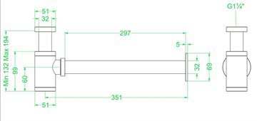 Røret har en diameter på Ø32 mm, som mod væggen afsluttes med den matchende roset, som har en ydre diameter på Ø70 mm. Selve tilslutningsmålet til afløbet er G1/4.