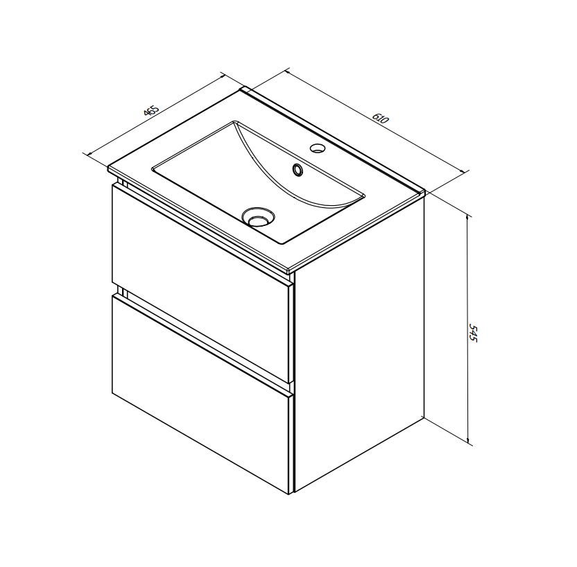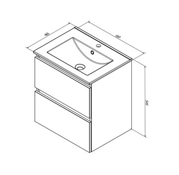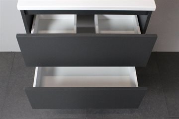 Underskabet er med 2 skuffer der med softclose lukker blidt uanset påvirkning. Skufferne er med masser af plads til håndklæder og alt andet du har brug for at have lige ved hånden. Den stilrene porcelænsvask giver møblet et let og smalt udseende. Øverste skuffe har udskæring så der er plads til vandlåsen samt praktisk inddeling så alt hele tiden ligger på sin plads.