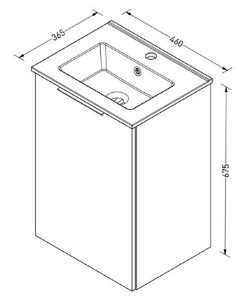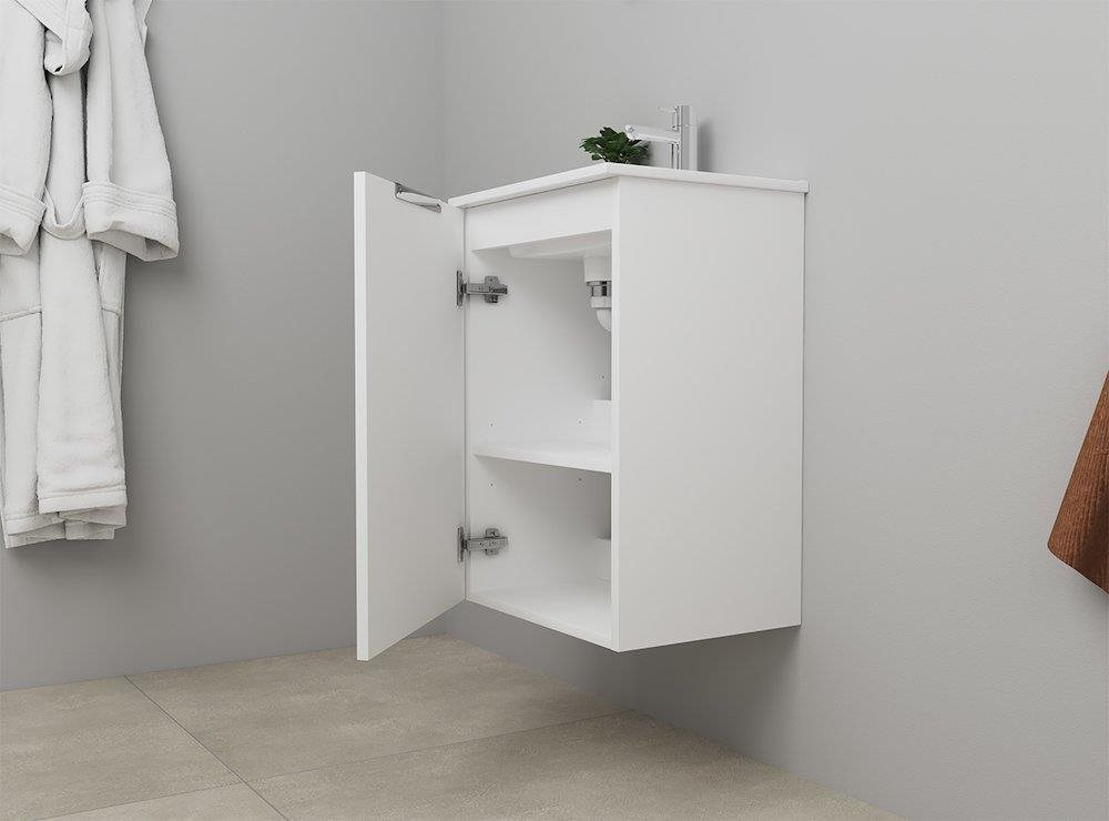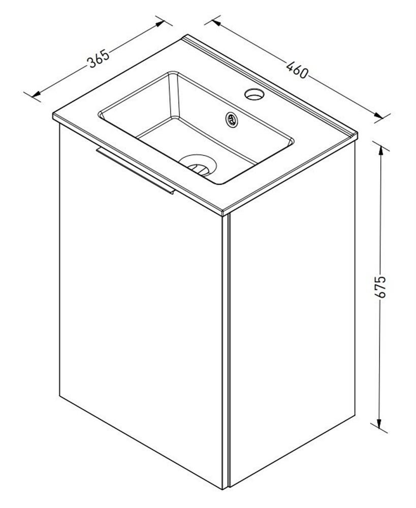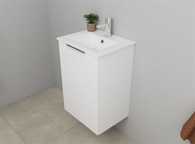 Sanibell Online møbelsæt 46x36,5cm mathvid leveres usamlet som flatpack. Sættet består af en porcelænsvask med overløb og hanehul samt et usamlet møbel med 1 universallåge som kan højre- eller venstrehængsles, 1 hylde og krom greb. Den justerbare hylde kan flyttes 5 cm op eller ned efter behov. Bag hylden samt i bunden af skabet er der 7 cm frirum til væggen, så der er god plads til rørføring.