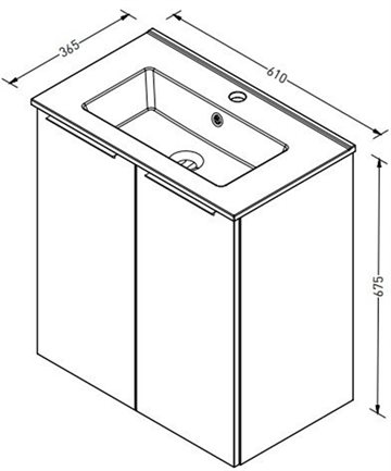 Sanibell Online møbelsæt 61x36,5cm mathvid leveres usamlet som flatpack. Sættet består af en porcelænsvask med overløb og hanehul samt et usamlet møbel med 2 universallåge, 1 hylde og krom greb. Den justerbare hylde kan flyttes 5 cm op eller ned efter behov. Bag hylden samt i bunden af skabet er der 7 cm frirum til væggen, så der er god plads til rørføring.