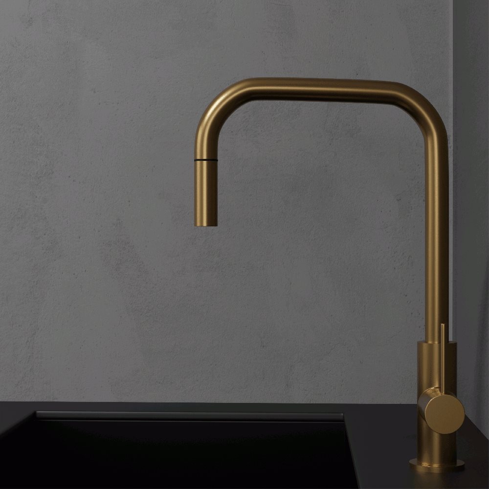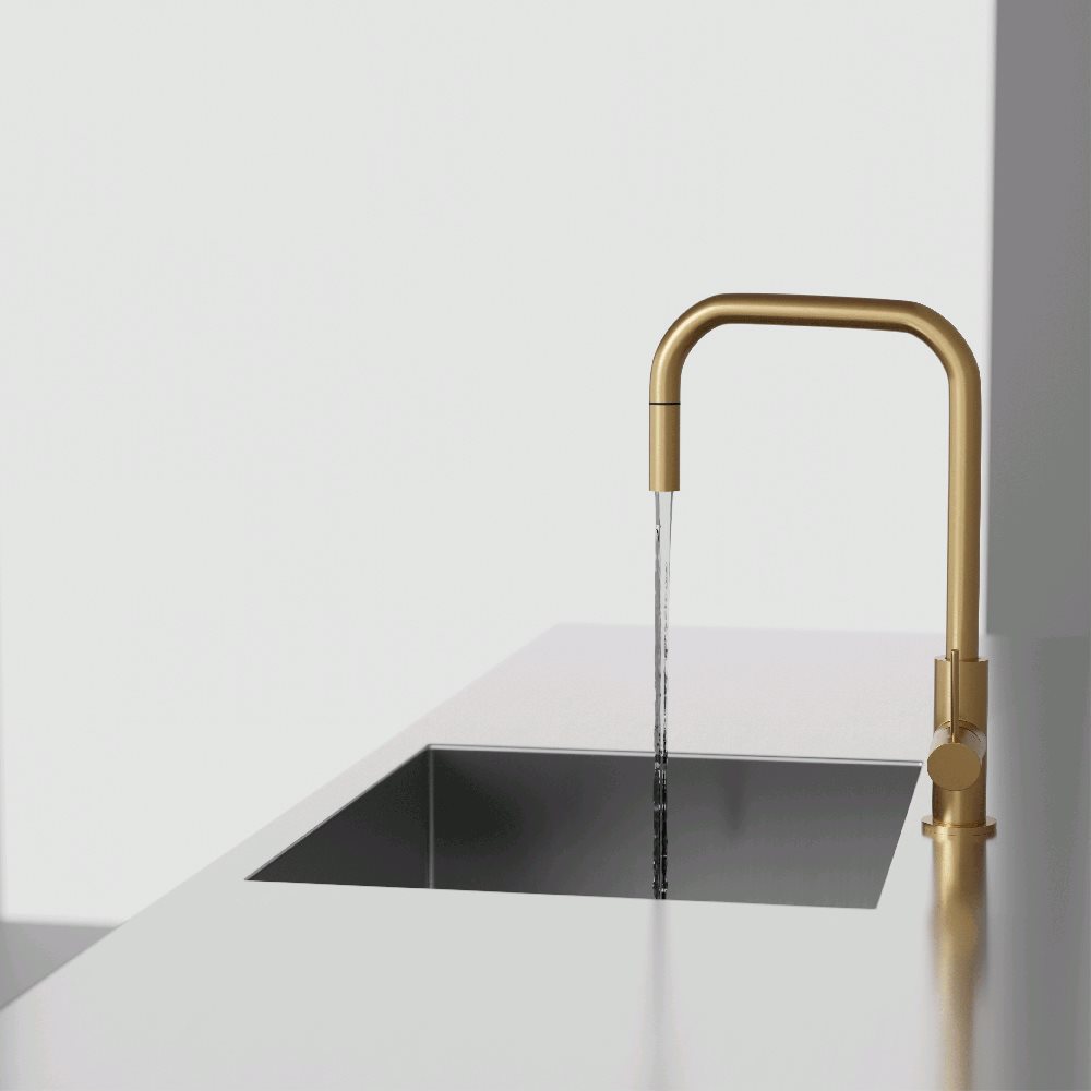 Primy Accent Square Køkkenarmatur med udtrækstud Sand (messing look) - svingtuden kan dreje 360 grader og udtræks længden er 30-40 cm