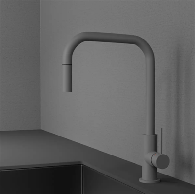 Primy Accent Square Coal Køkkenarmatur m/Udtrækstud, Scrap (mat mørkegrå) - svingtuden kan dreje 360 grader.