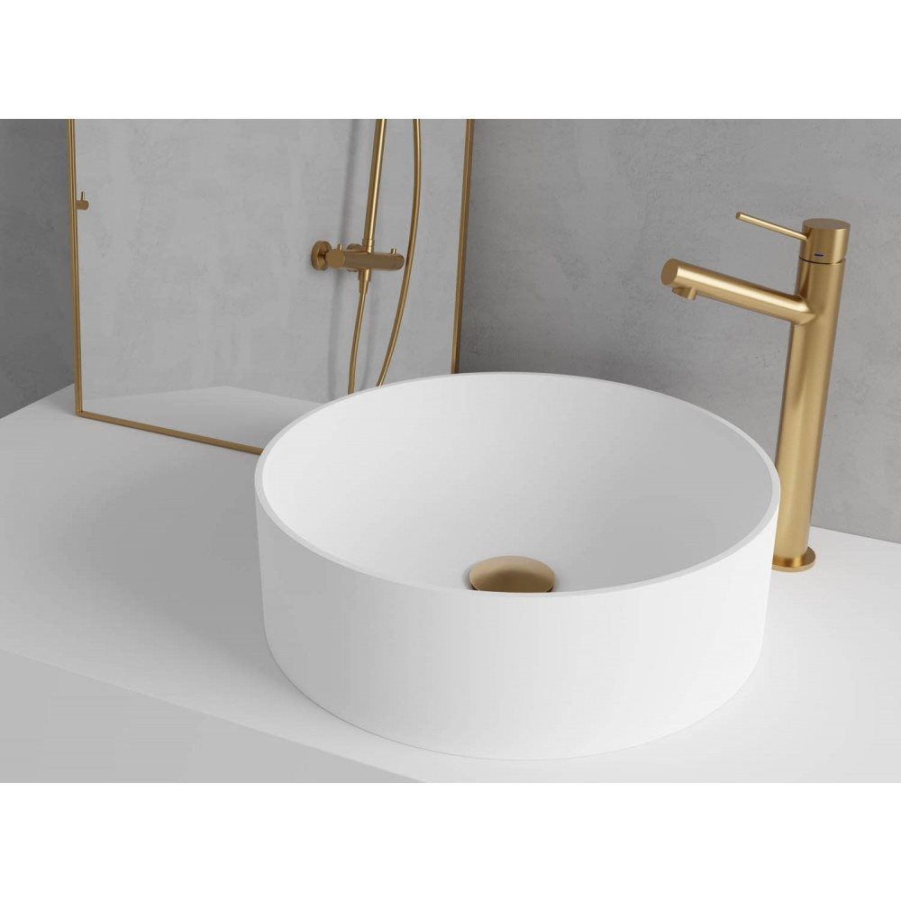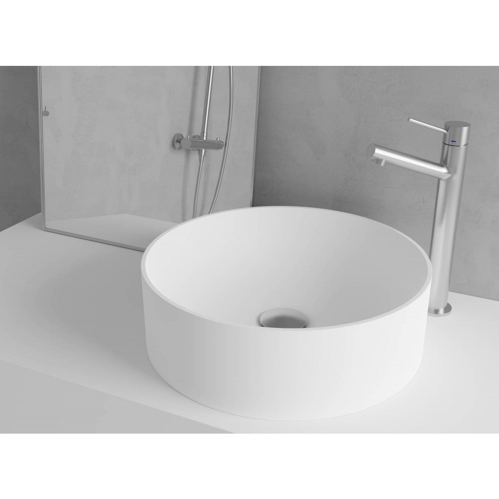 En flot vaske bowle i stringent og enkelt design. Den runde Solid surface badeværelsesvask placeres ovenpå bordplade eller møbel, hvor servantevasken fremstår elegant i sit tidløse design.