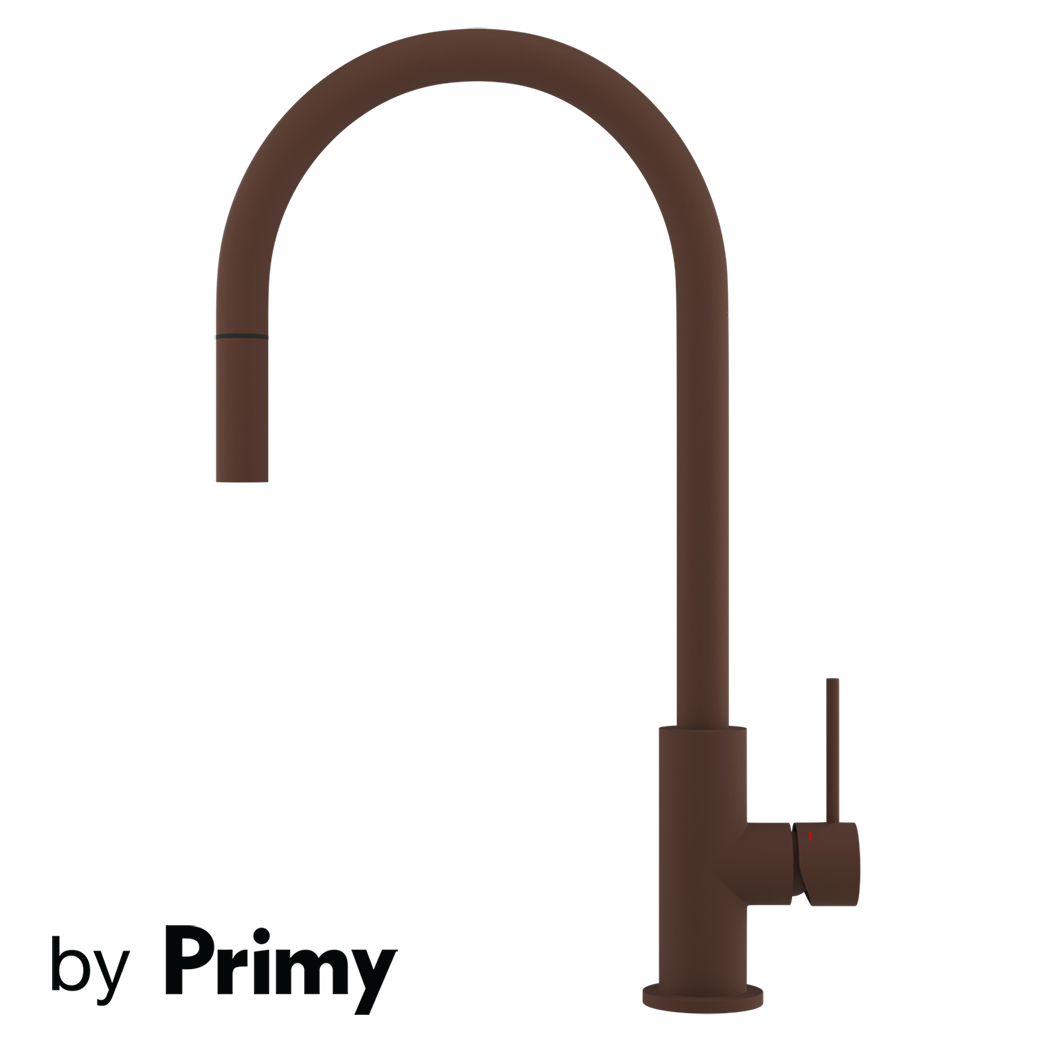 Primy Steel Accent Rust køkkenarmatur med udtrækstud i brun - svingtuden kan dreje 360 grader.