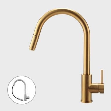 Primy Steel Access Sand køkkenarmatur med udtrækstud i messing look - svingtuden kan dreje 360 grader. Et tidløst formsprog og smarte funktioner, der gør arbejdet ved køkkenvasken lettere.