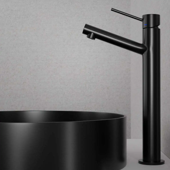 Primy Steel Vector High Sand Håndvaskarmatur Shadow sort til fritstående håndvask, tuden er diagonal så der er masser af plads under den - Leveres uden bundventil. Designet er tidløst og karakteristisk for Primy's chefdesigner Venkat Tirunagaru.
