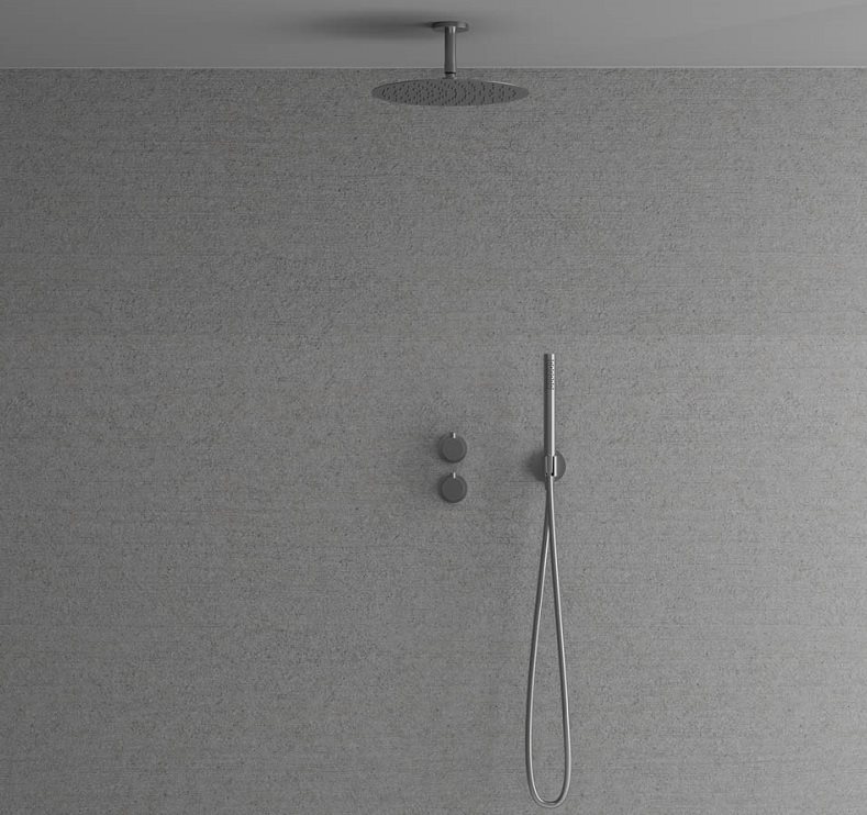Primy Steel Harmonized 2x termostat brusearmatur for indbygning i loftet med Ø300 hovedbruser for montering i loftet med et 85 mm loftsbruserør.