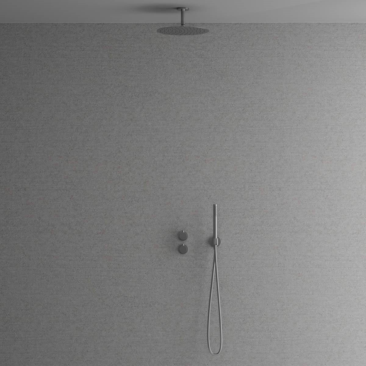 Primy Steel Harmonized 2x termostat brusearmatur for indbygning i loftet med Ø300 hovedbruser for montering i loftet med et 85 mm loftsbruserør.