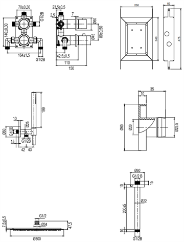 Brusearmaturet består af en tynd Ø300 mm stor hovedbruser med bruserør for loftsbefæstigelse, en cylindrisk håndbruser der levere en behagelig strøm af vand med bred spredning. Betjeningen af indbygningsbrusearmaturet er enkel og logisk. På det ene af grebene bestemmes temperaturen mens der på det andet vælges om vandet skal ledes ud af den generøse hovedbruser eller ud af håndbruseren.