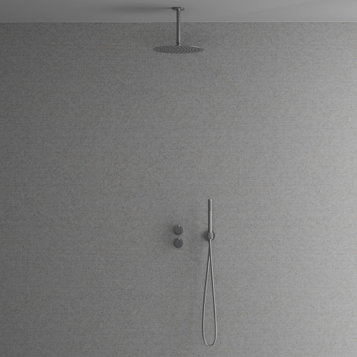 Primy Steel Harmonized 2x termostat brusearmatur for indbygning i loftet med Ø300 hovedbruser for montering i loftet med et 200 mm loftsbruserør.