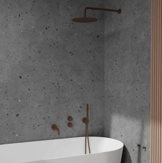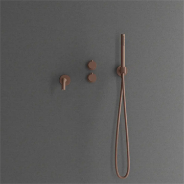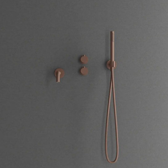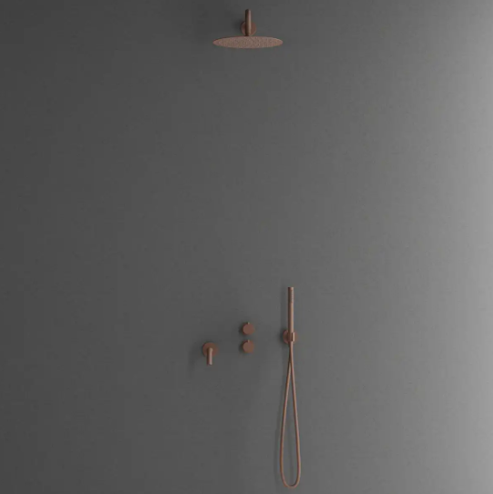 Primy Steel Harmonized 4 termostat kar brusearmatur for indbygning, komplet med indbygningsdel kartud og vægmonteret hovedbruser i Rust.