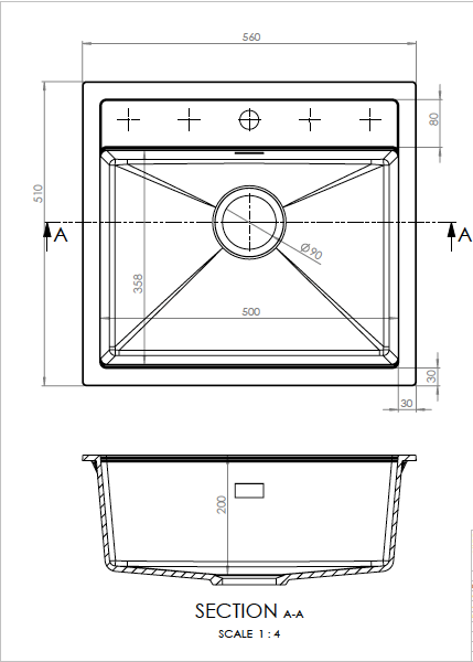 Denne køkkenvask er til nedfældning eller ilægning i bordpladen. Det vil sige, at vasken monteres ovenfra og ned i udskæringen (hullet) i pladen. Vaskens flange eller yderkant ligger og hviler ovenpå bordpladen.