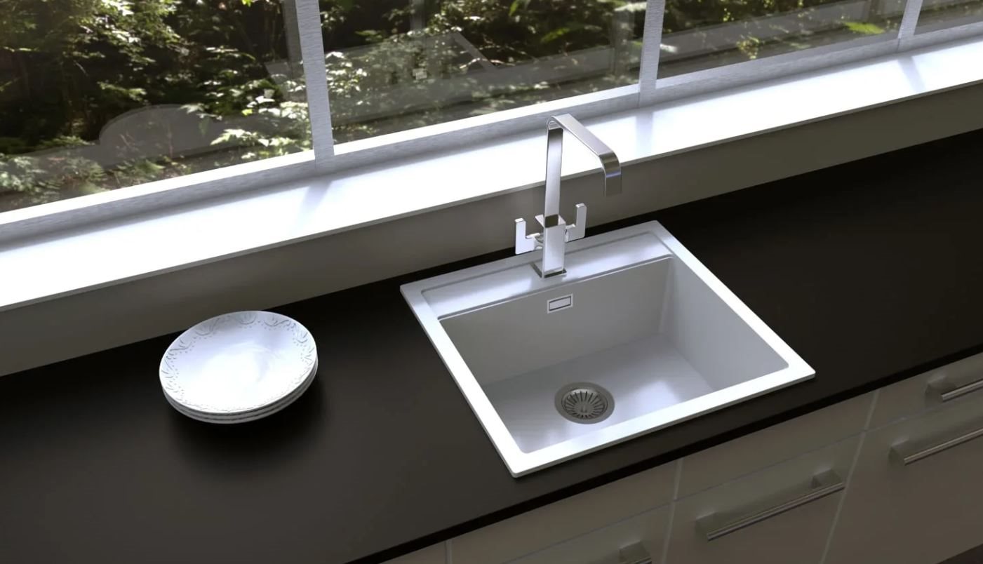 Forny dit køkken med denne moderne og tidsløs køkkenvask i hvid granitek med kuverttryk i kummen, som leder vandet til afløbet samt et praktisk bredt bagpanel med hanehul til køkkenvandhanen.