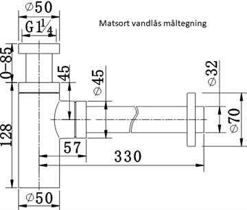 Røret har en diameter på Ø32 mm, som mod væggen afsluttes med den matchende roset, som har en ydre diameter på Ø70 mm. Selve tilslutningsmålet til afløbet er G1/4.