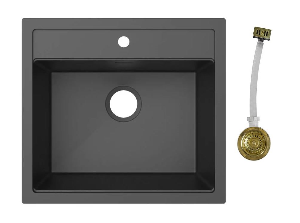 Secher køkkenvask 56x51 cm sort granitek med messing natur af-og overløbssæt
