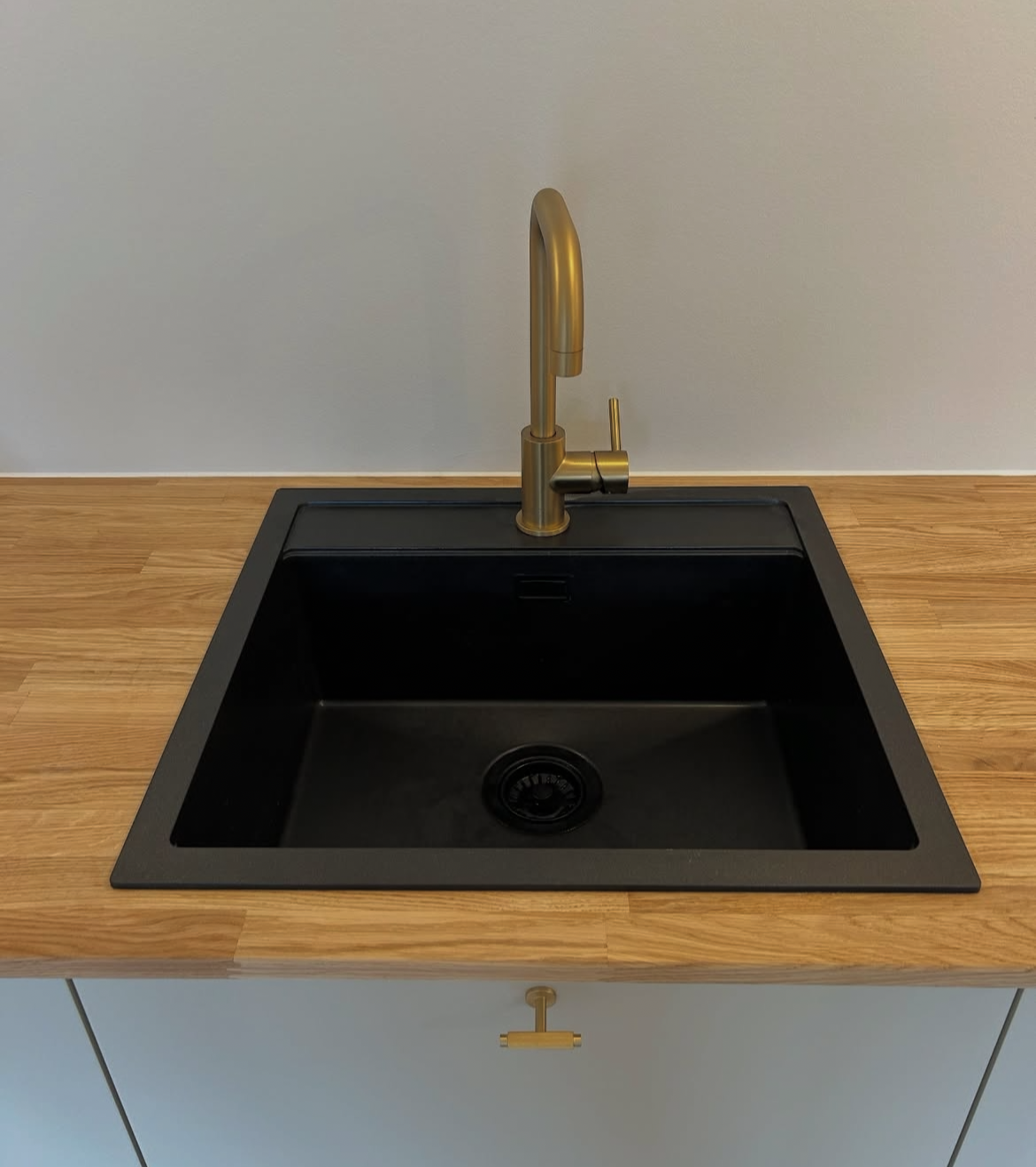 Secher køkkenvask 56x51 cm til nedfældning i sort granitek med sort af- og overløbssæt