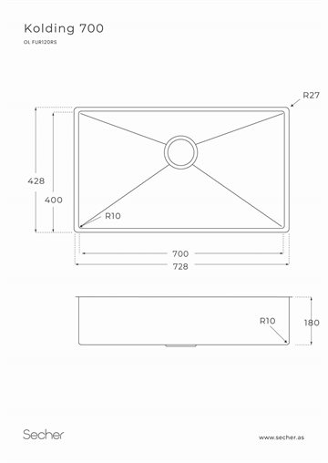 Secher Kolding 700 køkkenvask 700 x 400 mm til underlimning. Rustfrit stål