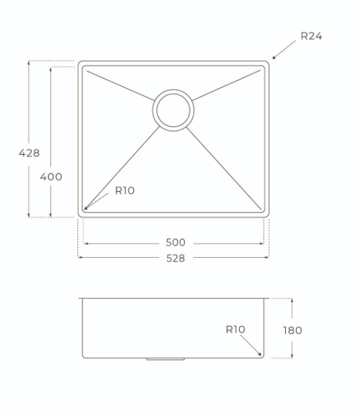 De indvendige runde hjørner gør samtidig køkkenvasken rengøringsvenlig. Kuvertbunden betyder, at vandet nemt løber i afløbet.