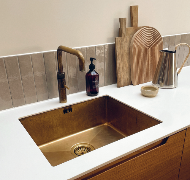 Ved en underlimet vask - Her monteres (limes) vasken nedefra og op i en tilsvarende udskæring på undersiden af bordpladen. Køkkenvasken har gennemtænkte detaljer som indvendige runde hjørner, der følger vaskens yderkant, der giver et harmonisk design.