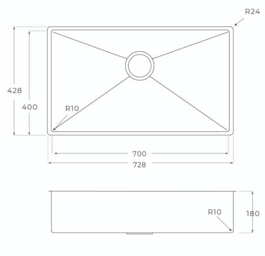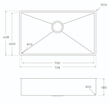 De indvendige runde hjørner gør samtidig køkkenvasken rengøringsvenlig. Kuvertbunden betyder, at vandet nemt løber i afløbet.