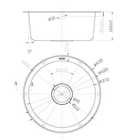 Secher Tønder 370 rund vask t/køkken Ø 430 mm. Rustfrit stål