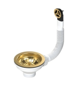 Sættet består af kurveventil og rundt overløb i trendfarven messing