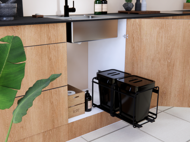 • Smart, moderne affaldssystem med praktisk udtræksstativ i sort metal