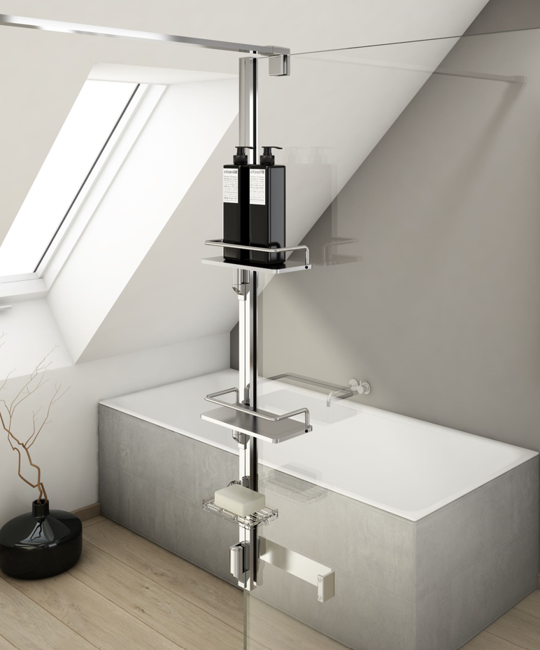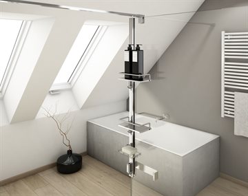 Med denne elegante og praktiske SMART opbevaring, er slut med at opbevare Shampoo med mere på gulvet eller ovenpå armaturet.  Bruse opbevaringsløsning, er let at montere og det gøres uden at der er behov for at bore i væg og fliser idet den monteres direkte på brusevæggen. Den passer til glastykkelser fra 6 - 12 mm uanset fabrikat.