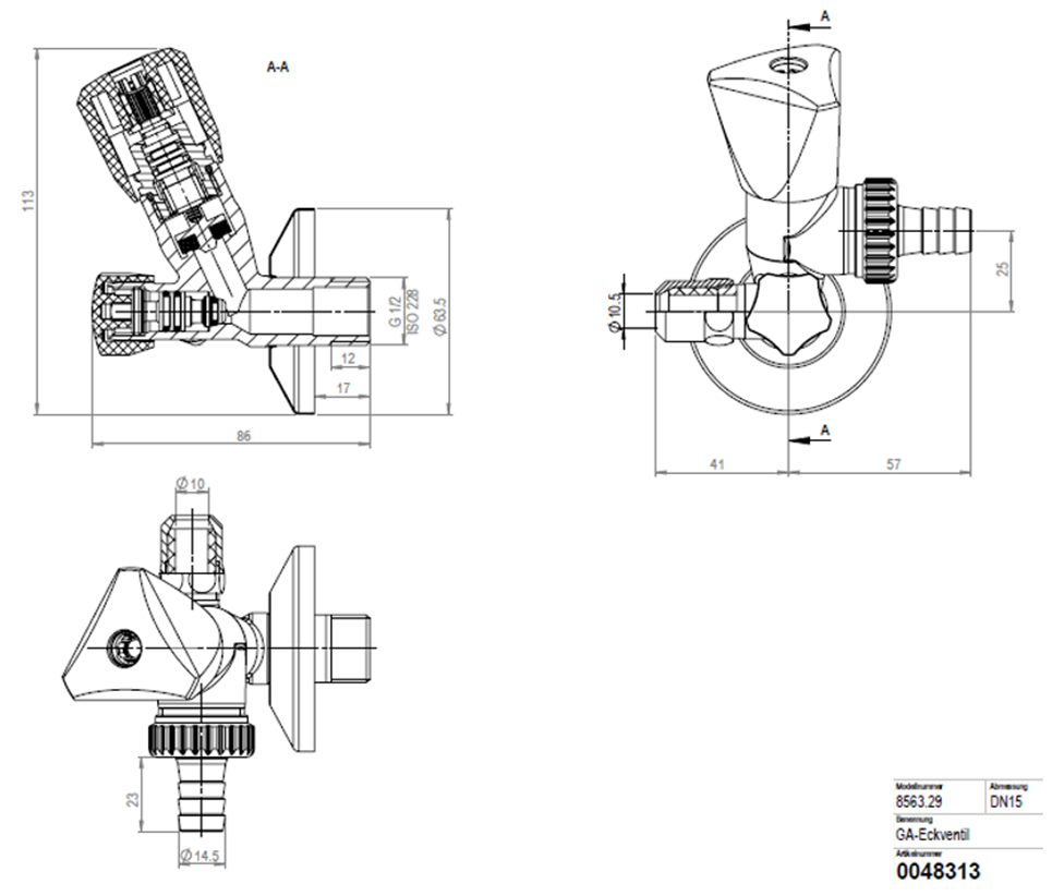 1/2" x 10 mm stopventil vinkel  m/aftap højre m/studs