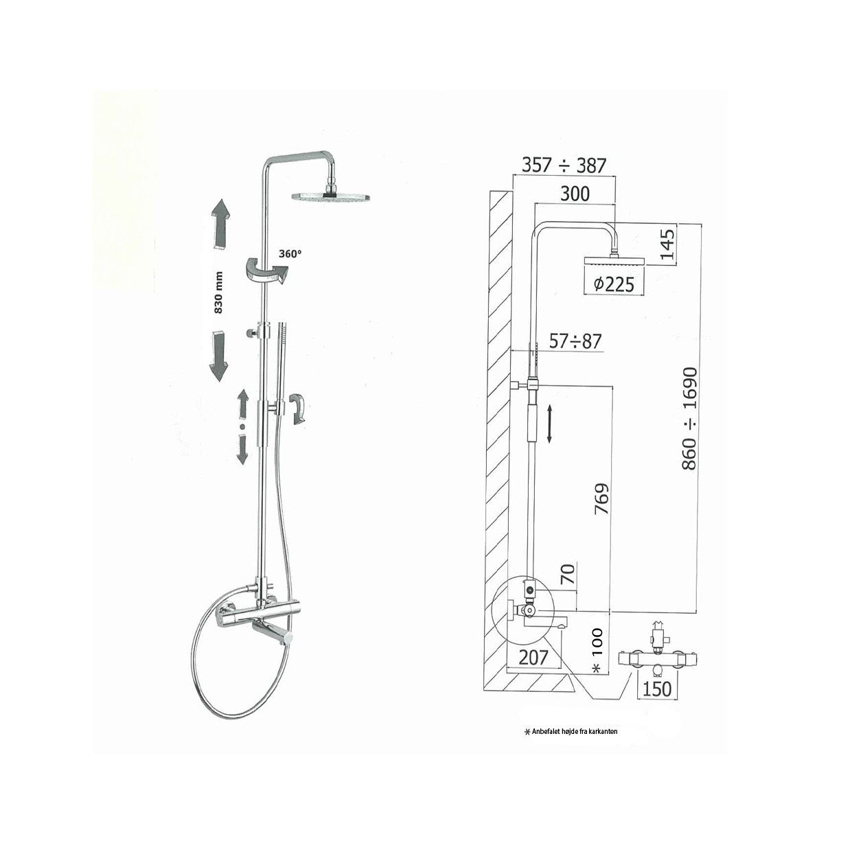 Strømberg Ligro Showerpipe, termostatarmatur til badekar i krom med omskifter, hovedbruser Ø 225 mm, 1,5m håndbruser med QuickClean anti-kalk funktion.