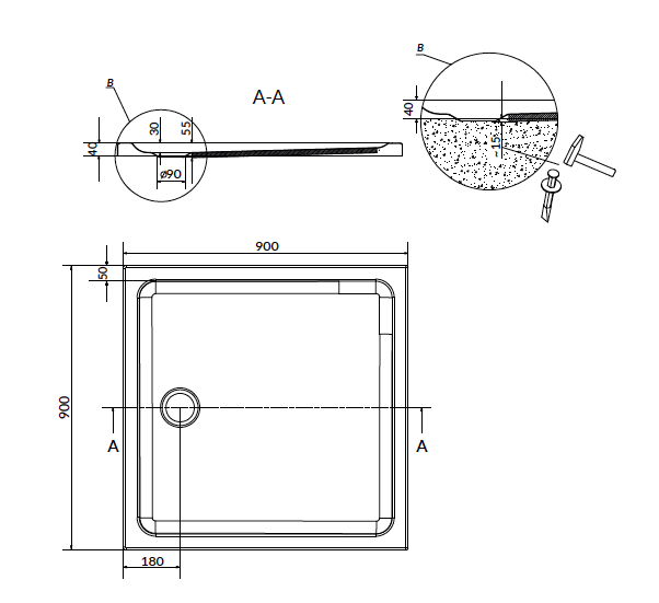 TAKO by ECO-LINE Rektangulær brusekar 90 x 90 x 4 cm til placering på gulv