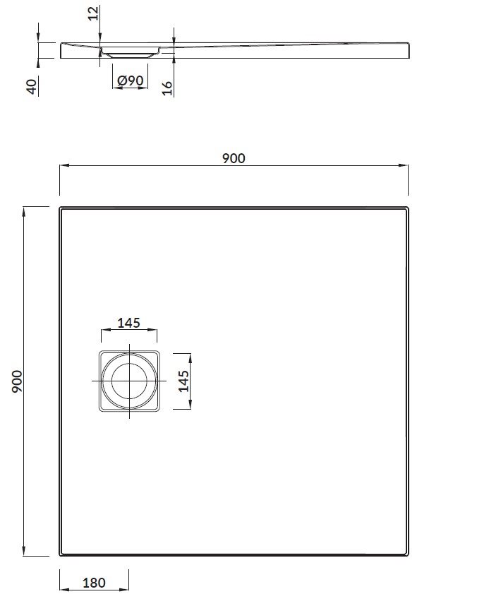 TAKO Slim by ECO-LINE Rektangulær brusekar 90 x 90 x 4 cm til placering på gulv eller plan med fliserne.