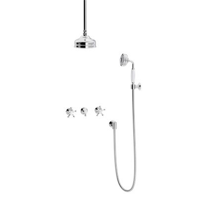 TONI Copenhagen Christiansborg Indbygnings brusebatteri med loftsmonteret hovedbruser og håndbrusersæt i krom.