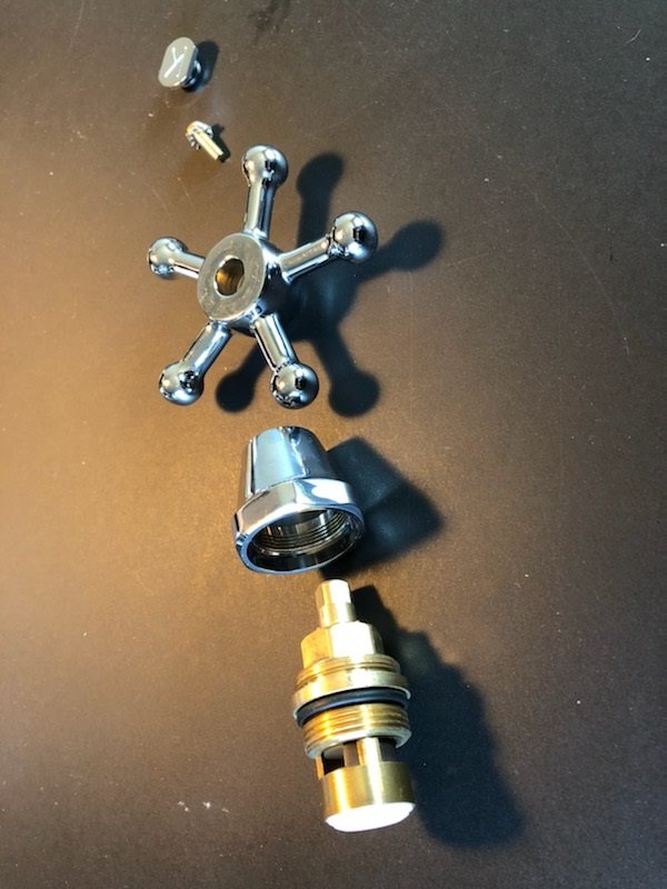 Dette gøres ved at fjerne V eller K dækproppen (afhængig af om det den kolde eller varmehane der er utæt), start med at løsne skruen med en ligekærvet skruetrækker, fjern grebet, løsen omløberen (brug en klud, malertape eller lignende) for at beskytte forkromningen eller messing afhængig af hvilken overflade armaturet er i og sidst men ikke mindst, så skrues ventilen ud af huset. Nu er du klar til at isætte den nye ventil og følge førnævnte i omvendt rækkefølge.