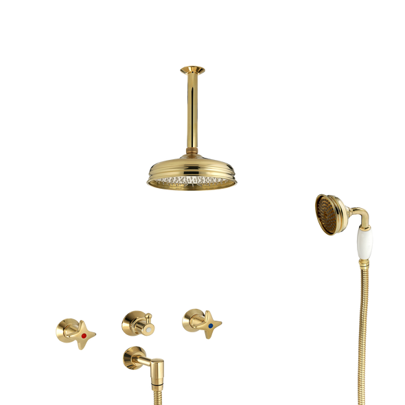 TONI Copenhagen Krydsgreb indbygnings brusebatteri med loftsmonteret hovedbruser og håndbrusersæt i messing -